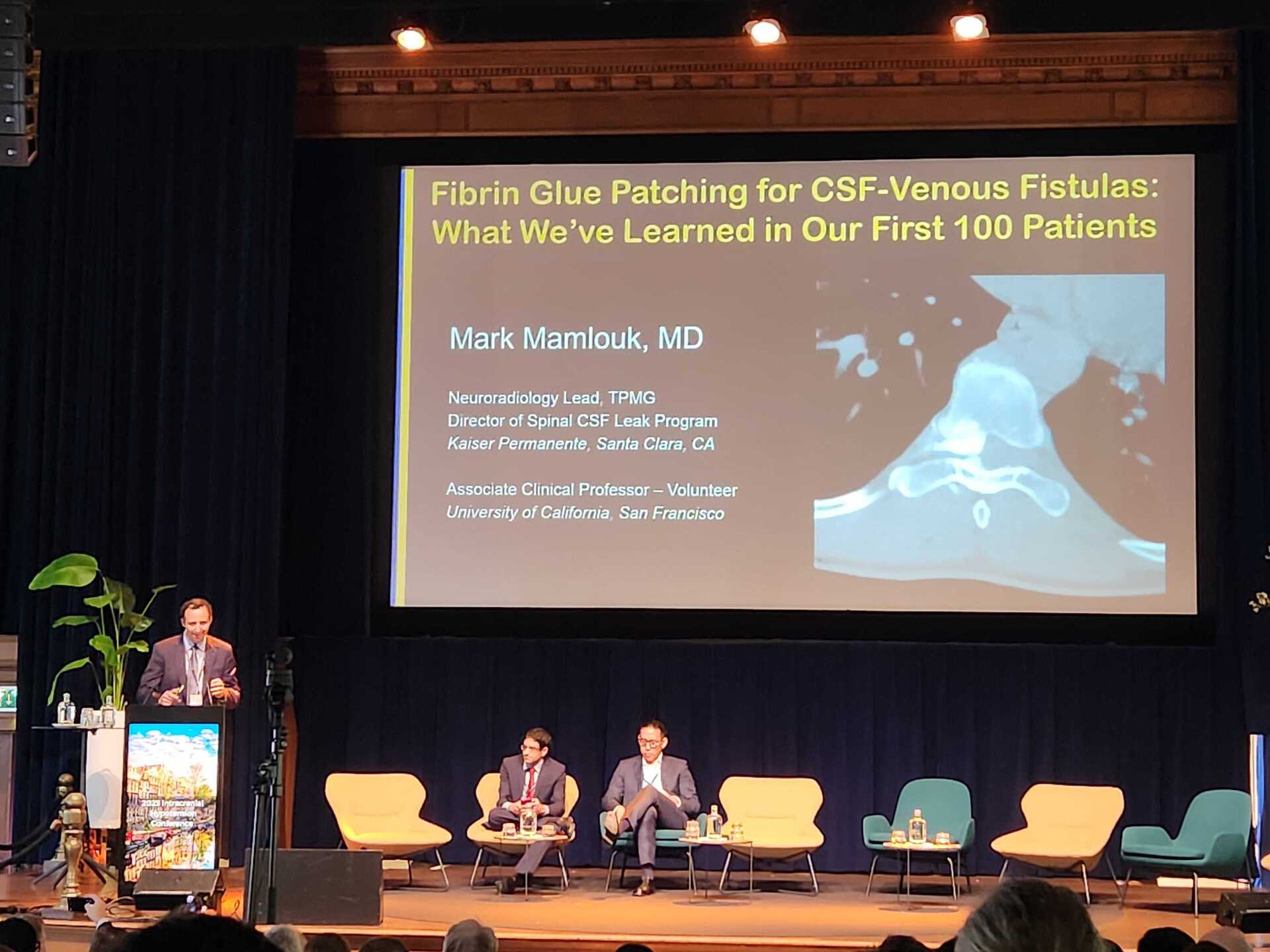 ![]() Medical Advisory Board Member Dr. Callen presenting about challenges in SIH, and the profound impact on patients. | ![]() Medical Advisory Board Member Dr. Mamlouk presenting about fibrin glue patching for CSF-venous fistulas. |